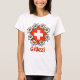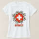 Stilvolle Edelweiss umgeben eine Schweizer Fahne mit dem freundlichen Schweizer Gruß unten.