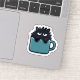 A fun and moody sticker featuring a grumpy black cat sitting inside a blue coffee mug. Perfect for cat lovers who enjoy sarcastic, cute, and aesthetic designs.
