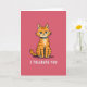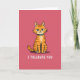 This funny greeting card features a orange tabby cat sitting front and center against a bright fuchsia pink background. The cat faces forward with narrowed aqua-blue eyes and slightly furrowed brows, giving it a grumpy, unimpressed look. Its fur is shaded in warm oranges with cooler blue accents, and the simple outlines keep the illustration easy to read at a glance. Around its neck is a teal collar that stands out sharply against the cat’s coat. Near the bottom of the card, white block letters in a sans-serif style read “I TOLERATE YOU,” making the message feel dry and funny. The overall scene is minimal, but it still lands as a sweet, teasing way to show affection—perfect for a friend or partner who enjoys a little sarcasm ❤️❤️