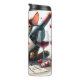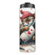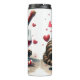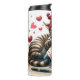 Dieses humorvolle Bild zeigt eine gruselige, gestreifte Katze mit einer roten Mütze und einer großen Flasche Wein. Ein Glas Wein sitzt neben einem Holztisch und einem Schreibtisch. Floating rote Herzen und eine sarkastische Botschaft auf der Note ergänzen das lustige Valentinthema und stehen im Gegensatz zu den romantischen Elementen der Katze mit dem grauenhaften Ausdruck.