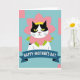 Diese Karte zeigt vorne eine stilisierte zweifarbige Katze, mit einem weißen Körper und scharfen schwarzen Markierungen auf dem Kopf und den spitzen Ohren. Ein großer, weicher rosa Blumenkranz mit frischen grünen Blättern umrahmt das Gesicht und verleiht ihm einen süßen, liebevollen Ausdruck, der zum desinteressierten Blick der Katze kontrastiert. Die verengten gelben Augen und der leichte Schmollmund verleihen ihr einen trockenen, lustigen Charme, als ob sie die Aufmerksamkeit mit stiller Treue akzeptiert, anstatt überschwänglich emotional zu reagieren ❤️. Der Hintergrund ist ein ruhiges hellblau, das die Szene luftig und offen hält. In der Nähe der oberen Ecken fügen kleine rosa Rechtecke einfache Akzente hinzu, ohne den Fokus von der Figur abzulenken. Am unteren Rand erstreckt sich ein tiefblaues Banner über die gesamte Breite, und die Worte „HAPPY MOTHER'S DAY“ erscheinen in weißen, groß