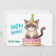 Celebrate birthdays with a humorous twist! This colorful cartoon card features a grumpy cat wearing a festive birthday hat, sitting atop a pink frosted cake with sprinkles. The cat’s piercing blue eyes and unimpressed expression add charm and humor to the design. A playful, slightly messy “Happy Birthday” sign hangs in the background, enhancing the celebratory feel.