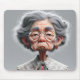Eine ältere Frau mit übertriebenen Merkmalen trägt eine Brille und eine rot-weiße Gingham-Bluse mit Spitzen-Kragen