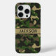 Passen Sie diese mehrfarbige grüne und braune Tarnung-Hülle für das iPhone 15 Pro mit Ihrem Namen in einer trendigen modernen CAP-Schrift in Braun auf Khaki an. Sie ist männlich und perfekt für Ihren Lieblings-Militär-, Jagd-, Land- oder Outdoor-Fan!