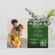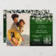 Eine stilvolle Hochzeitseinladung mit Ihrem besonderen Foto und hübschen Weisen- und Lila-Blätter, Saitenleuchten, Mason-Gläsern und Ihrem Hochzeitsdetails-Set in elegantem Text auf einem smaragdgrünen rustikalen Holzhintergrund. Entwickelt von Thisisnotme©