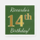 Dieses einfache Papier-Serviette-Design enthält eine Nachricht wie "Riccardo’s 14. Geburtstag!", die "14." hat ein goldenes Aussehen von Imitaten auf grünem Hintergrund. Der Name kann personalisiert sein. Es könnte auf einer Geburtstagsfeier für jemanden verwendet werden, der seinen vierzehnten Geburtstag feiert. [~Z0000081]