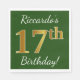 Dieses einfache Papier-Serviette-Design enthält eine Nachricht wie "Riccardo’s 17. Geburtstag!", mit dem "17.", das ein goldenes Imitat auf grünem Hintergrund hat. Der Name kann personalisiert sein. Es könnte auf einer Geburtstagsfeier für jemanden verwendet werden, der seinen siebzehnten Geburtstag feiert. [~Z0000081]