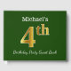 Dieses Gästebuchdesign weist die Ordinalnummer "4." mit einem goldähnlichen Imitat auf. Es enthält auch einen benutzerdefinierten Namen und einen grünen Hintergrund. Es könnte in einem Party für jemanden verwendet werden, der seinen vierten Geburtstag feiert. [~Z0000056]
