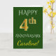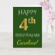 Dieses einfache, personalisierte Hochzeitstag Grußkarte Design beinhaltet die Nachricht "HAPPY 4. JAHRESTAG", mit der "4." ein Imitat goldenes Aussehen. Die Vorderseite hat auch einen benutzerdefinierten Namen und einen grünen Hintergrund. Im Inneren finden Sie eine individuell gestaltbare Begrüßungsbotschaft zum Hochzeitstag. Es könnte einem Ehemann oder einer Ehefrau zur Feier des vierten Hochzeitstages des Ehepaares gegeben werden. [~Z0000086]