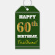 Dieses Geschenk-Tag Design enthält eine Nachricht wie "HAPPY 60. BIRTHDAY, FirstName!", wo der Name angepasst werden kann, und wo die Zahl "60." ein Imitat/Imitation goldfarbigen Aussehen hat. Die Vorderseite hat auch einen grünen Hintergrund. Auf der Rückseite befindet sich eine "From:"-Zeile. Geburtstagsgeschenke wie diese könnten vielleicht für Geschenke verwendet werden, die jemand zum sechzigsten Geburtstag bekommt. [~Z0000210]