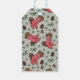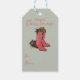 Dieses festliche Land To/From gift-Tag bietet ein von Hand gezeichnet Paar Cowgirl Weihnachtsschuhe, die zwischen Pinecones, Kiefern und Heiligen Beeren auf der Vorderseite sitzen. Die Rückseite weist ein lustiges Muster mit denselben Western-Elementen auf. Eleganter, grüner Hintergrund.