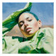 Ein beeindruckendes, sonnenbeleuchtetes nah-up-Portrait einer Frau in lebhafter, grüner Kleidung, stehend vor dem Hintergrund einer warmen Wüstenlandschaft. Die Pose der Frau ist ausdrucksvoll und zuversichtlich, wobei sich ihre Hand anmutig auf ihrem Kopf ruht und ein Gefühl von Eleganz und Bewegung schafft. Der klare blaue Himmel kontrastiert wunderschön mit ihrem Outfit, was die grünen Farbtöne mutig hervorhebt. Dieses Bild zeigt eine moderne Mischung aus Mode und Natur und zeigt die harmonische Verbindung zwischen lebendigen Farben und natürlicher Umgebung. Ideal für diejenigen, die einen kreativen und stilvollen Ausdruck in der Außenfotografie suchen.