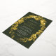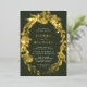 Elegante Hochzeitseinladungen mit Vintagem botanischen Rahmen. Goldene Rose, Blätter und Sprigs umgeben Ihre Zeremonie Details. Namen und Blumenakzente sind in echter metallischer Folie dargestellt. Gold auf dunkelgrünem Hintergrund.