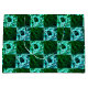 Grüne und himmelblaue oder zyanfarbene Schachbretter, mit kleinen verworrenen Rechtecken und hellen und dunklen Tönen, die eine Wahrnehmung metallischer Teile und Tiefen hervorrufen können.