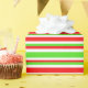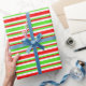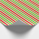 Dieses Weihnachtsdesign ist mit roten, weißen und grünen Streifen gestaltet. So ein Umschlagpapier kann bei der Vorbereitung von Geschenken oder Geschenken verwendet werden, die anlässlich eines Geburtstages, einer Hochzeit, eines Jahrestages oder eines anderen Ereignisses gegeben werden.