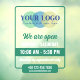 Bringen Sie diesen Aufkleber für Öffnungszeiten an Ihrem Schaufenster an, um Kunden, Klienten und Passanten wissen zu lassen, wann Sie geöffnet sind und wie Sie Kontakt mit Ihnen aufnehmen können. Personalisieren Sie mit Ihrem Firmenlogo, Ihrer Telefonnummer und Ihrer Website. Der Aufkleber für Öffnungszeiten hat ein klares und modernes Design in Weiß und Grün, um leicht lesbar und auffällig zu sein.