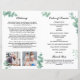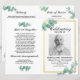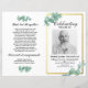 [Alle Texte sind EDITABLE] Kostenfreundliches Doppelseitiges Beerdigungsprogramm mit einem Foto auf der Vorderseite und 2 Fotos auf der Innenseite. Thema: Grüne Eukalyptus-Blätter. Stil: Elegant und ruhig. Geschlecht: Unisex. Farben: Grün, Weiß, Imitate Gold. Grafik: Aquarell handgezeichnete Eukalyptus-Blätter, Imitate Goldrahmen.