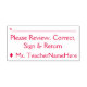 Diese Briefmarke beinhaltet die Nachricht "Bitte überprüfen, korrigieren, signieren & zurückschicken", zusammen mit einer Zeile für eine Signatur oder Initialen, die oben geschrieben werden sollen. Es enthält auch den Namen eines Lehrers oder Lehrers, der individuell angepasst werden kann. Es könnte von einem Lehrer, Erzieher oder Tutor genutzt werden, um die Eltern oder Vormund eines Schülers fragen, um die Arbeit des Schülers auf einem Test, einer Zeitung oder einem anderen Auftrag zu überprüfen.