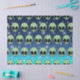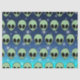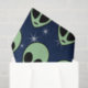 Ein grünes Alien Kopfmuster mit großen schwarzen ovalen Augen und einem kleinen schwarzen Schnitt für einen Mund. Der Hintergrund ist eine dunkel bis hellblaue Farbskala mit weißen Sternen.
