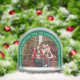 Es gibt ein Platzhalter-Familienfoto in einem Bogen, umgeben von einem grünen Bogen mit weißem Text und Schneeflocken.