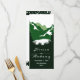 Grüne Berge und Nadelbäume Zeremonie und Party Hochzeitskarte. Ein elegantes Hochzeitsdesign mit einer Bergkette durch Koniferen und Ihre Namen in handgeschriebenem Stil. Auf der Rückseite befinden sich dunkelgrüne und weiße Ränder mit weißen Polka-Punkten oben und unten auf der Karte.