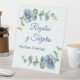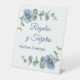 Guía a tus invitados con elegant utilizando este letrero de pedestal para el bautizo. Decorado con hojas verdes en acuarela y bonitas flores azules, este letrero añade un toque de sofisticación a tu evento mientras dierna los invitados hacia el área designada para los 'regalos y tarjetas'. Führe deine Gäste elegant mit diesem Taufbecken. Dieses Schild ist mit grünen Aquarelltönen und hübsch blauen Blätter geschmückt und verleiht Ihrem Event eine Touch der Eleganz, während Sie die Gäste in den dafür vorgesehenen Bereich für "Geschenke und Karten" führen.