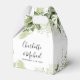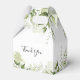 Elegante Hochzeitsvorgeschenkbox mit grünen Blätter, schicken Signatur-Skriptnamen und einem besonderen Datum. Sie können mit Ihrer eigenen Danksagung auf der Rückseite personalisieren. Ein perfekter Weg, um sich bei Ihren Gästen zu bedanken! Entwickelt von Thisisnotme©