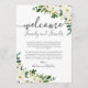 Benutzen Sie unsere Begrüßungskarten für das weiße Blume- und Grün-Hochzeitshotel, um Ihre Gäste aus der Stadt zu empfangen und lassen, dass sie mehr über Ihre Hochzeitsreise erfahren. . Verwenden Sie Zazzle's "Personalize this template" Tool, um Ihre Informationen zur Hochzeitszeremonie einzugeben. Wenn Sie die Platzierung der Textfelder, der Schriftart oder der Größe ändern möchten, klicken Sie einfach auf den Button "Weitere Anpassungen vornehmen", um diese Dinge zu ändern. Lassen Sie sich von unserer großen Auswahl an koordinierenden Gegenständen in der modernen White Floral Wedding-Kollektion verzaubern!