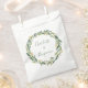 Personalisierte Gastgeschenk Hochzeit Tasche mit Namen in einer Skriptkalligrafie in einem grün, gelb und rosa gestrichenen botanischen Kranz Aquarell.