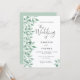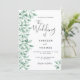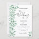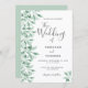 Eine trendige botanische Hochzeitseinladung in Weiß und Grün. Ein schick weißer Hintergrund auf der Vorderseite. Die Einrichtung ist mit Grün, Blattwerk und Grünpflanzen geschmückt. Moderne, große handhabete Schrift, Typografie mit dem Text: Die Hochzeit von. Vorlagen für Ihre Vornamen und Hochzeitsdetails. Dunkelgrauer Text. Zurück: hellgrüner Hintergrund.