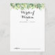 Dieses grüne botanische Blatt Hochzeit Worte der Weisheit Ratgeber Karte ist perfekt für eine einfache Hochzeit. Dieses wunderschöne Aquarelldesign zeichnet sich durch botanisches grünes Blattwerk aus. Diese Karten sind ideal für Hochzeiten, Brautparty, Babydusche, Graduiertenfest u.v.m. Personalisieren Sie die Karten mit den Namen der Braut und Bräutigam, den Eltern, die Sie werden oder Absolvent.