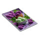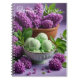 Eine Schüssel mit grünem Eis, die sich neben lila Blume in einer schlichten und eleganten, süßen Esskomposition mit Minzfässern befindet. Personalisieren Sie dieses Notebook, fügen Sie Ihren Namen, oder Monogramm.