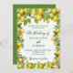 Ein grüner, wasserfarbener Hintergrund. Gelbe Zitronen und grünes Blattwerk. Personalisieren Sie Ihre Namen und Details und fügen Sie diese hinzu. Der Name wird mit einem handgeschriebenen Stilskript geschrieben. Zurück: grüner Hintergrund