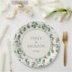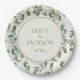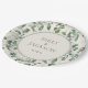 Elegante Salbei grüne Eukalyptus-Blätter auf cremefarbenen Hochzeitspapier-Tellern. Umfasst die Namen der Braut und des Bräutigams sowie deren Hochzeitstag. Text ist vollständig anpassbar, genau wie man es will. Kontaktieren Sie uns für Hilfe bei der Anpassung und der Anpassung der Produkte.
