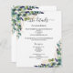 Eine moderne, elegante Hochzeitsdetails/Programm/Zeitleiste. Weiße, mit Eukalyptusgrün und goldgelbem Blattwerk dekorierte Räume. Personalisieren und fügen Sie Ihre Namen und Hochzeitsdetails. Schwarze Buchstaben. Text auf beiden Seiten. 1 Blatt = 1 Programm, mit der Kante bis Kante bedruckt.