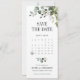 Elegante grüne Foto Kalender Save the Date Karte mit Aquarell eucalyptus Blätter und weiches botanisches Blattwerk. Dieses elegante Design mit moderner smaragdgrüner Palette eignet sich hervorragend für Hochzeiten im Frühjahr oder Sommer. Eine zeitlose Wahl für Paare, die eine naturbelassene, romantische und von Blattwerk inspiriert Hochzeitsstätte Liebe haben. Koordiniert wunderschön mit passenden Einladungen und RSVP-Karten aus derselben Sammlung.