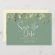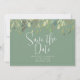 Moderne Save the Date Ankündigungen verfügen über Aquarellfarben-Eukalyptus-Blätter, die auf grünem Hintergrund mit grünen, anpassbaren Textblöcken in modernen Schriftart angeordnet sind. Fügen Sie den QR-Code der Hochzeitswebsite auf der Rückseite hinzu.