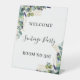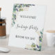 Ein schick weißer Hintergrund. Dekoriert mit grünen Aquarellen Eukalyptus-Blätter, Grünpflanzen, Imitaten vergoldeten Blätter und Lavendel-Blume. Personalisieren und fügen Sie einen Namen und eine Zimmernummer hinzu.