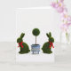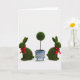 Entworfen mit einem ausgewogenen Stillleben-Layout zeigt diese Karte drei dekorative Elemente, die ordentlich auf einem hellweißen Hintergrund angeordnet sind. In der Mitte steht ein runder, grüner Formschnitt auf einem schlanken Stiel, der in einen blau-weißen Keramiktopf mit kleinen Gitterausschnitten und kleinen Füßen gesetzt ist. Auf beiden Seiten sitzen zwei grüne Häschenfiguren 🐰 mit aufgerichteten Ohren, perlenartigen dunklen Augen und einer flauschigen, moosähnlichen Textur. Jeder Hase trägt eine rote Schleife am Hals, und ihre leicht nach innen geneigte Haltung deutet auf eine zarte, freundschaftliche Nähe hin 🐇. Sanftes, diffuses Licht hebt den Kontrast zwischen der texturierten Oberfläche der Hasen und der glatten Glasur des Topfes hervor und sorgt dafür, dass die Grün-, Rot- und Blautöne leicht zu erkennen sind. Der Grußtext ist oben in einer sanften gr