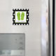 Ein personalisierter Magnet, der eine Abbildung eines grünen Flip-Flops in einem weißen Quadrat mit grüner Schnittfläche zeigt. Der Hintergrund ist schwarz mit weißen Polka-Punkten.