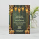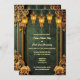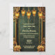 Ein wunderschöner brauner, blumenreicher Hintergrund in einem tiefen Waldgrün wird durch einen verzierten goldenen Rahmen gerahmt, der zwei goldene indische Elefanten an den unteren Ecken hat. Fünf glühende Laternen hängen von der oberen Kante, und an den Seiten erscheinen zarte vertikale Linien. Dieses Hindi inspirierte Design hat weiße Vorlagen für Ihre benutzerdefinierte Formulierung und die Rückseite hat eine zusätzliche Vorlage für weitere Details für Gäste und Familie, die entfernt werden können, wenn nicht erforderlich. Die warmen Farben verleihen diesem Design ein luxuriöses, elegantes und gehobenes Ambiente. Diese Einladung ist ideal, um jede Hindu-Zeremonie oder jede ethnische asiatische Feier oder Hochzeit zu feiern.