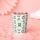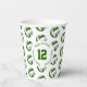 Diese Volleyball-Geburtstagsparty-Tassen mit mehreren kleinen grünen, grauen und weißen Volleybällen, die in einem einfachen Tropfenmuster angeordnet sind - Text auf einer weißen Kreisgrafik kann angepasst werden, derzeit 12 um ein Kinderzeitalter umkreist durch die Worte "Glücklicher Geburtstag" von katz_d_zynes