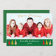 Ihr Familienfoto nimmt die Bühne in der Mitte ein, mit einer grünen Unterkante in Holiday. Oben auf der Karte, und über Ihrem Foto, ist "Frohe Weihnachten" in Gold Skript. Der grüne untere Rand enthält auf jeder Seite ein Trio aus roten, grünen und goldenen Bildern eines grafischen Kiefernbaums, in dem Ihr Text in zwei Felder unterteilt ist. Die Rückseite der Karte ist solide passend grün. *Tipp - Benutzen Sie "Anpassen", um Ihr Foto optimal zu positionieren. Sie können auch den Schriftart, die Farbe oder die Größe des weißen Textes auf dem grünen Rand ändern.