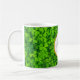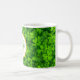 Eine maßgeschneiderte Tasse mit frischem Frühjahrsdesign mit üppig grünem Kleeblatt mit kleinen Wassertropfen. Personalisieren Sie mit Ihrem Namen und Monogramm initial in der Mitte auf einem weißen Rahmen mit einem IMITAT goldenen Folie.
