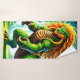 Dieses Badetuch hat eine grüne Kreatur darauf.
