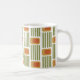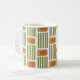 Diese Tasse hat ein modernes Design aus fünf grünen Linien und einem goldgerundeten Rechteck mit einem orangefarbenen, abgerundeten Rechteck, das sich über das Design wiederholt.