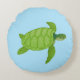 Schwimmende grüne Meeresschildkröte auf türkisfarbenem Hintergrund Rundkissen.