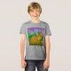 Kid's T-Shirt in einer niedlichen Ingwerkatze mit grünen Augen, liegt in einem Sommergarten aus roten Sternen und lila Hyazinthen