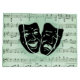 Künstlerisches Talent kommt in vielen Formen und wenn sie sich vereinen, ist es spektakulär. Die griechischen Theatermasken der Komödie und Tragödie liegen auf einem Notenblatt