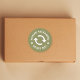 Ein gerecycelt Aufkleber für Ihre wiederverbrauchte Verpackung auf grünem rustikalem Kraftuntergrund. Fügen Sie diese Aufkleber in Ihre Kisten und Umschläge, um Ihre Kunden zu informieren und sie zu ermutigen, das Gleiche zu tun! Es ist perfekt für ein kleines Unternehmen!